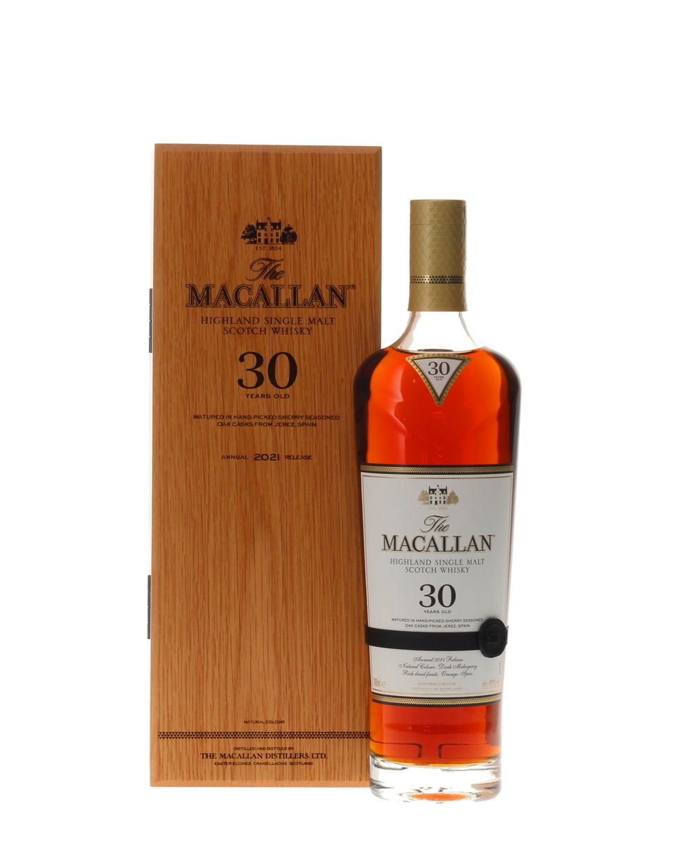 One of the world's most desirable single malt whiskies. The 30 year old Macallan is released every year in small quantities. This is the 2021 release all matured in sherry casks and bottled at 43%.