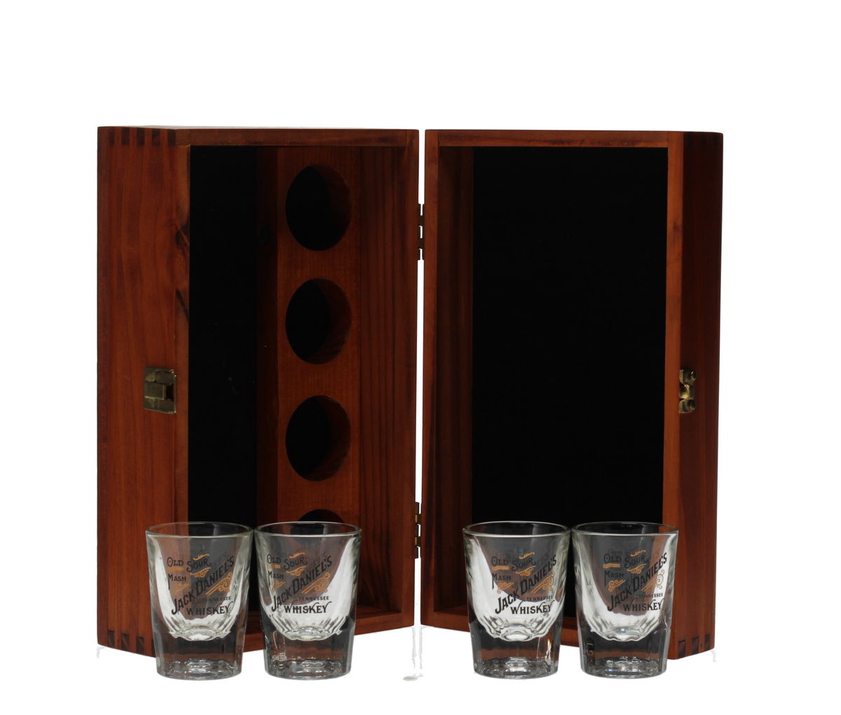 A special wooden Jack Daniels presentation box and Old Style heavy set Jack Daniel's Whiskey Tumblers.