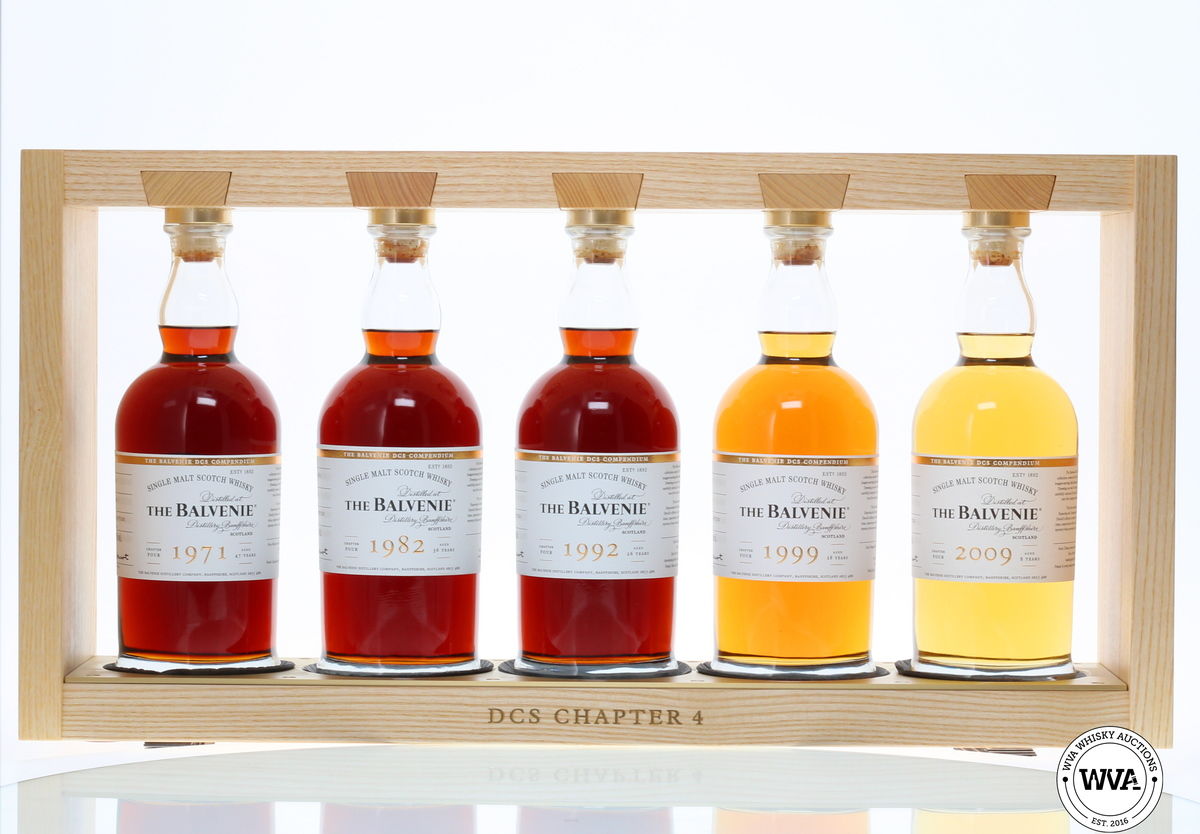 The fourth chapter of Balvenie's DCS Compendium is titled 'Expecting the Unexpected' All five bottles of extraordinary Speyside single malt from Balvenie's DCS Compendium Chapter Four are here, bound in a truly fantastic hand made leather case, including a whisky aged for 47 years. Only 100 of these cases have been produced and we believe only 2 were sold on UK shores. A very Rare Set indeed!