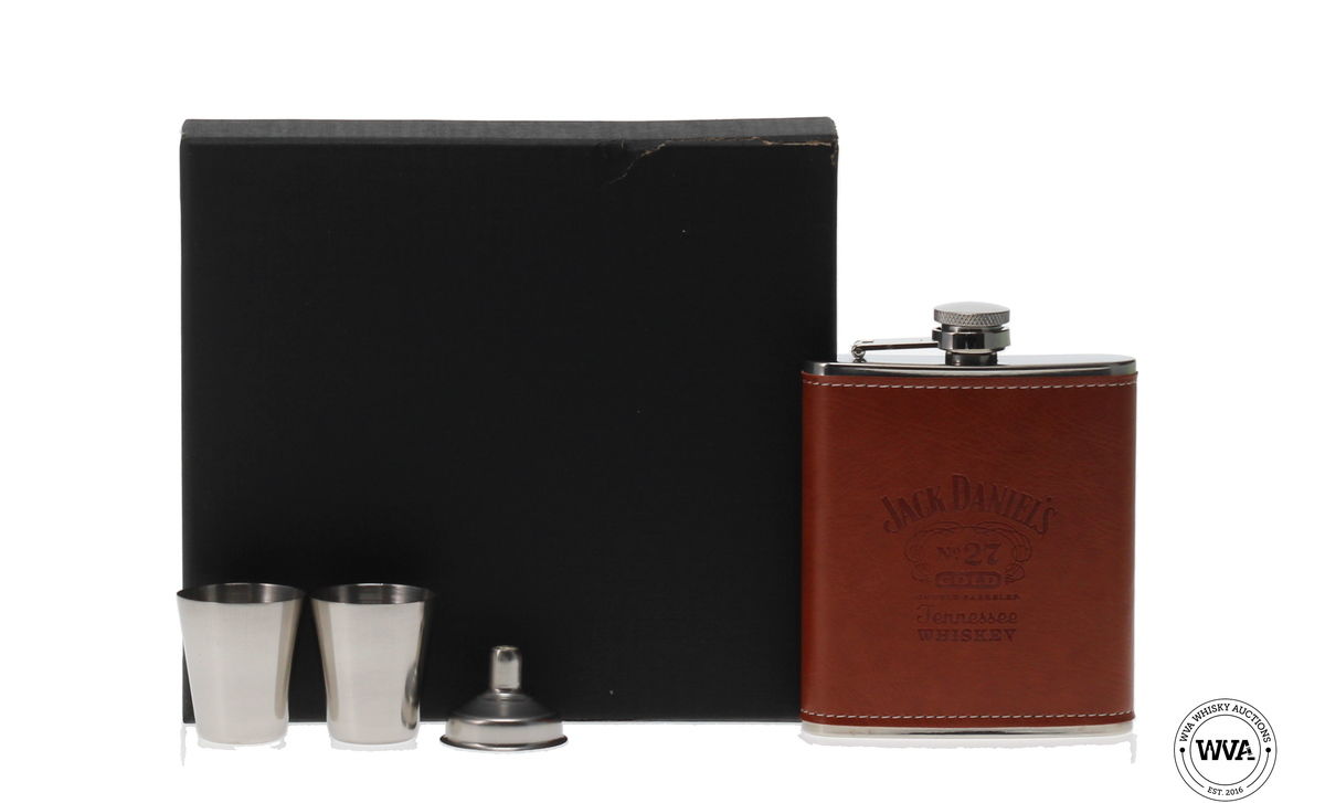 A leather bound Jack Daniels Hip Flask with 2 sip cups.