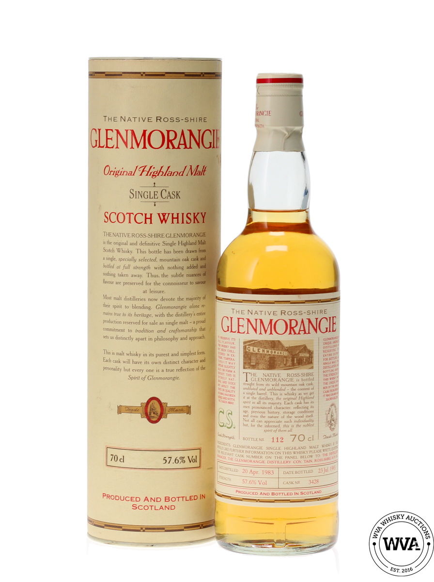 A superb old distillery bottling of Glenmorangie's 10 year old, back from their less fancy white label days. Distilled in 1983 and bottled 10 years later from cask #3428 at 57.6% in July 1993. This is bottle number 112.